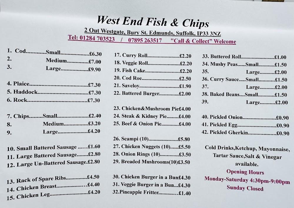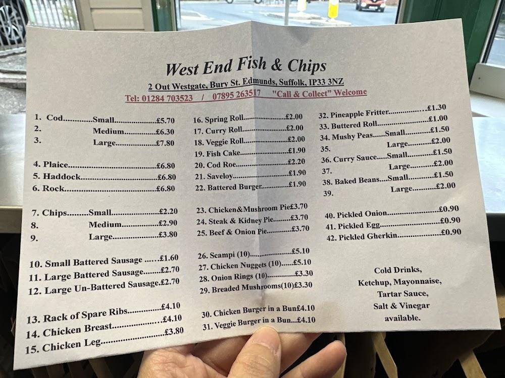 Nestled in Bury Saint Edmunds at 2 Out Westgate, West End Fish & Chips has established itself as a beloved local gem. The essence of the place is rooted in tradition, offering a nostalgic journey through classic British fare. Visitors and locals alike flock to this eatery for lunch and dinner, craving the quintessential fish and chips experience housed within a casual setting. The atmosphere buzzes with friendly chatter, making it perfect for solo diners looking for a quick bite or families enjoying a hearty meal together. Accessibility is a priority here, with wheelchair-friendly entrances and seating, ensuring a welcoming space for everyone.